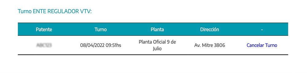 Una vez puesta la patente, te saldrá el turno que tenías arreglado y deberás cancelarlo haciendo clic en cancelar turno.